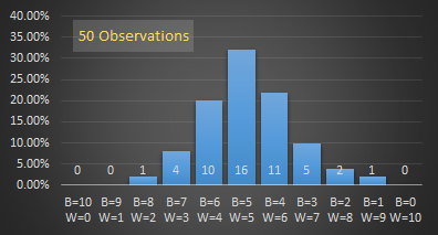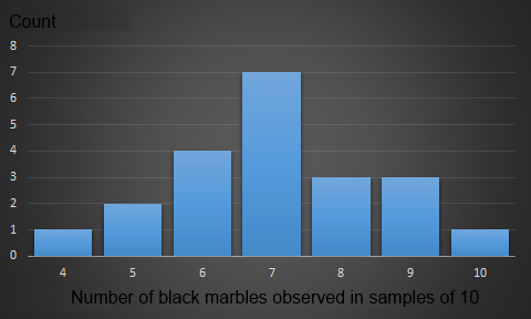 If you had to estimate the breakdown/distribution of the marbles based on this one sample, you could speculate that there are seventy black and thirty white marbles, but how confident are you? As we learned from the first experiment, just because there was a 7:3 ratio in the sample, it does not necessarily mean there is this same ratio in the urn. From the graphs/data above we can see, for instance, that it's perfectly possible to draw 7:3 marbles from an equal mix (in fact this will happen over 11% of the time with a balanced mix), whilst not the most likely, it is possible. |