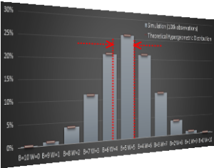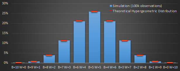 I promised to avoid math, but for completeness, here are the theoretical expected breakdowns of the probabilities in table form, and also plotted on graph (in red) alongside the results of a computer simulation of running the experiment 100,000 times. Without derivation, I’ll show the formula here for how to calculate the probability, and say that if you want to learn more about this, do a web search about Hypergeometric Distribution. (These curves are not Binomial curves because the marbles are selected without replacement; each marble drawn adjusts the concentration of marbles left). |