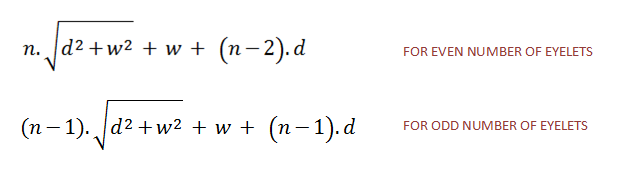 With an odd number of eyelet rows, there are the same quantity of straight sections and crossed sections (plus the bottom bar). With an even number of eyelet rows, there is one more section of crossed than straights (This is assuming, like in the earlier diagram, that you install the laces with a cross section at the bottom of the design. It's possible to alternate the design pattern so that the lowest section is straight and not crossed. If you select this design, the switch the n and the (n-2) terms in the top equation).