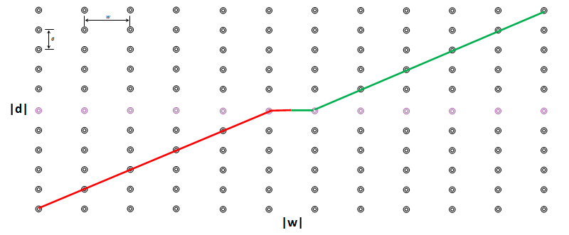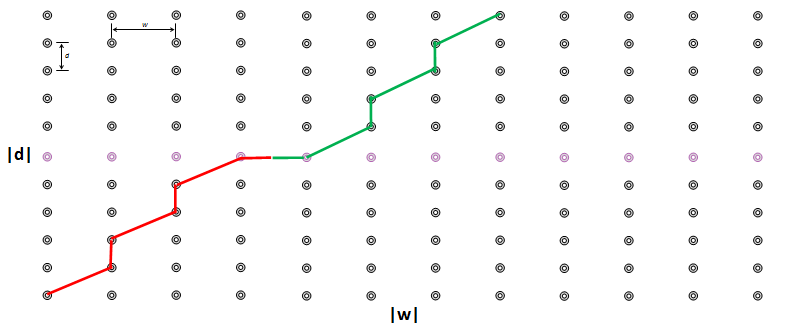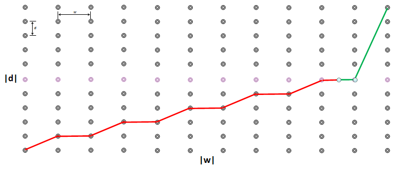 To do this, examine the plots below. These are scalar plots of the length of the laces. Each move to the right in the chart shows a measurement of the lace in the w axis of the shoe, and each move upwards in the chart shows a measurement in the d axis of the shoe. The graph is sort of like each lace unraveled and attached on a peg-board. Each lace has to traverse the graph from one corner to the diametric opposite corner (completing the number of vertical steps and horizontal steps to alternate left-right, and to move from top-bottom-top of the shoe).