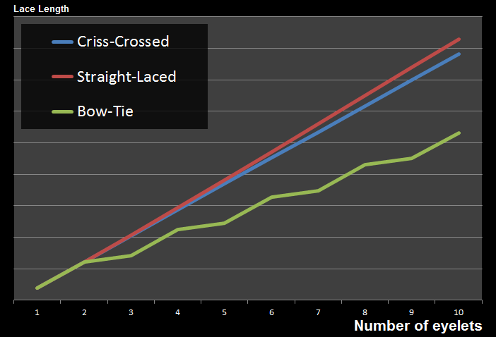 Plotting a chart of these three equations shows that, straight-laced always required the longest length of lace, Criss-Cross shorter, and Bow-Tie shorter still.