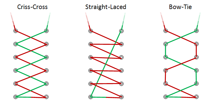 For Bow-Tie, things are a little more complex because it depends whether there are an odd or even number of rows of eyelets (the pattern alternates between criss-cross and side-lacing).