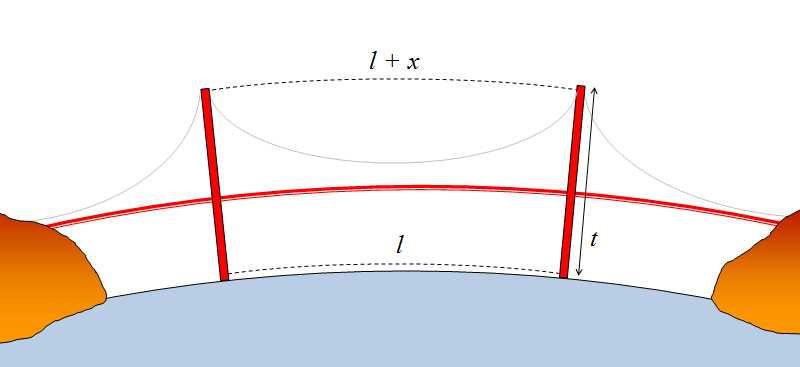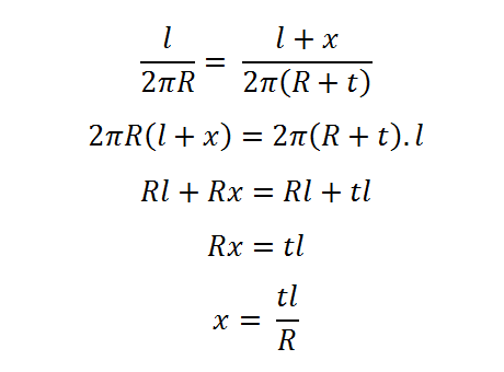 Similar to above, we'll calculate a ratio using the subtended angle. There are two similar segments, one with arc length l and a radius of R, and one with an arc length of l+x and a radius of R+t. Both of these segments share the same subtended angle on the globe. The top equation on the right shows the ratio of the lengths of the arcs to their respective circumferences. A few lines later, and we have a simple formula for the difference between the two arcs. |