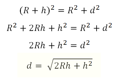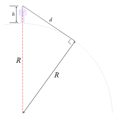 If we stick with assumption that the Earth is a sphere (and a smooth and uniform one at that), we can produce a diagram like the one on the left. A man of height h stands on a sphere of radius R and looks out to the horizon. The furthest point he can see is defined by the tangent that grazes the Earth and passes through his eye. By definition, a tangent is normal (perpendicular) to the radius and so we can create a right-angle triangle with a hypotenuse of length (R+h). For the two sides of the right-angle, one will be of length R, and the other will be the distance the man can see (which we’ll label as d). |