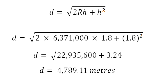 An adult person of around 6 ft tall has eyes approximately 1.8 m above the ground (yes, I'm using the Metric system). For the radius of the Earth, I'm going to use the value 6,371 Km (the mean radius).