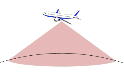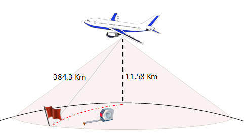 An airliner cruising at 38,000 ft is at an altitude of 11.58 Km Plugging this into the formula reveals an answer of 384.3 Km, which is 238.8 miles. NOTE – The distance to the horizon we caclulate with our derived forumla is the straight line distance from the viewer to the ground (the edges of the cone in the diagram to the left). How different is this to the distance that would be measured if we started directly under the plane, and pulled a tape measure around globe to the point where the tangent scrapes the surface? |