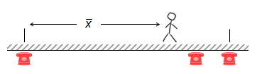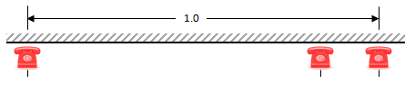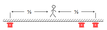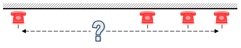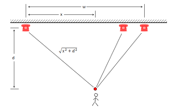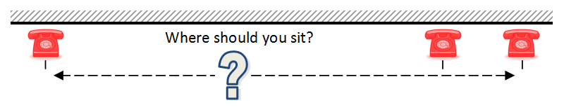 Should you stand at one end? That’s great if the phone you are standing next to rings (one chance in three), but for the other two times you have to walk, and one of these walks is the entire length of the room. Even if you chose to stand at end closest to the middle phone, one chance in three you’d have to walk a long distance. Clearly if you were going to stand at one end, there is a better end to stand, but it’s not the optimal answer. |