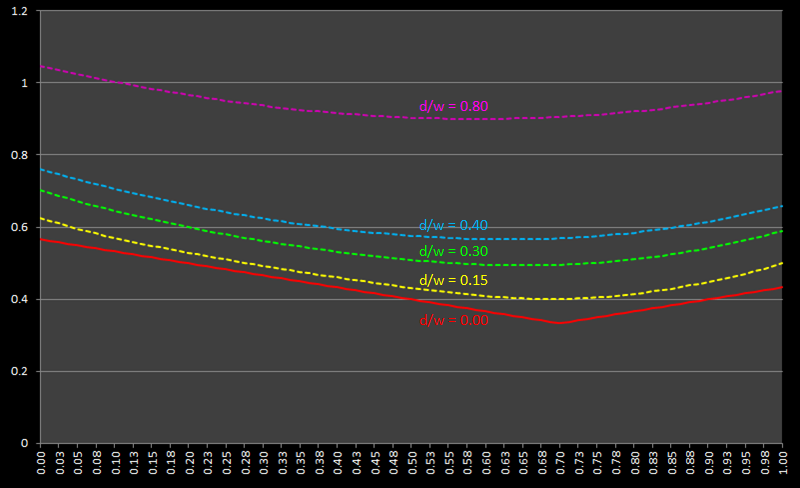 As the ratio of d/w increases two things happen: The first is that the minimum position migrates away from the median position and moves towards the center. The second is that the curve “flattens” (there is less difference between the longest and shortest possible distance that can be traveled).
