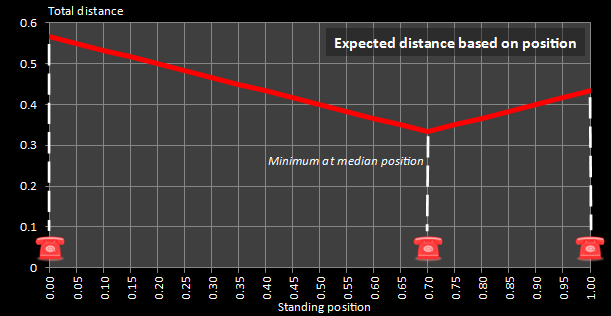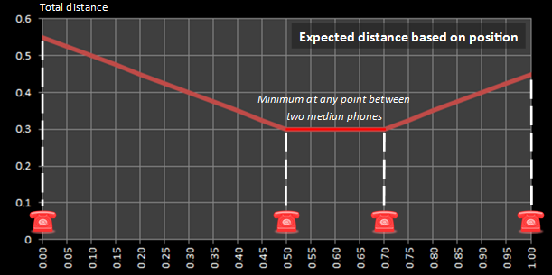 In the graph on the right I’ve show the average distance to travel for all positions between the two end phones. In this example, I’ve placed the middle phone at position 0.7 In this chart you can clearly see the minimum distance occurs when you stand directly over the middle phone. This is the median position. |