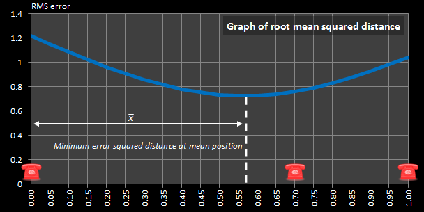 Remember back to discussion about the mean position? To the left is a graph of the average sqr (sum of squares) of the distance traveled. In our example, the mean is (0.0 + 0.7 + 1.0) / 3 which equates to 0.567, and you can see on the graph to the left this corresponds to the minimum in the function. |