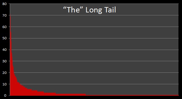 There are total of 1,278 different words that follow the, and the distribution follows a classic long tail curve, with 706 of these words only occuring once (approx 60%).