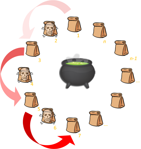 So, we have our answer for when there are 2n ingredients, but what happens if there are 2n+1 ingredients? Well, this is not much more complicated, because the monster pushes ingredient #2 into the pot, and now we are back to a 2n problem; the only thing that has changed is that the safe position has rotated around from ingredient #1 to ingredient #3 (Do you see that?) After eliminating the extra ingredient, the problem returns to the 2n case! |