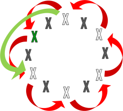 Obviously, being a hungry monster, he’s not going to finish throwing in ingredients after one circuit, he’s going to carry on going. Of course, now, there are less ingredients outside, but this does not stop him. He’s going to carry on with the “skip one”, “toss one” strategy until there is just one ingredient left. In the diagram on the left, the red arrows show the progress in the first circuit (starting from the top), the green arrow shows what will start to happen on the next circuit. On each loop around the circuit there will be fewer and fewer ingredients. The monster makes you a deal: If you are the last ingredient left, you are free to go. He also tells you that you are free to stand anywhere in the circle you choose. You quickly count and determine there are 99 other ingredients in the soup (making 100 including you). Where should you stand to avoid being turned into a monster’s lunch? |