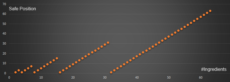 Using the function log2 in combination with the floor function, we can determine the power of two that does not exceed the number of ingredients, and using a little algebra, we can generate a formula for the generic safe position (where n is the number of ingredients).
