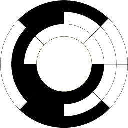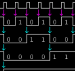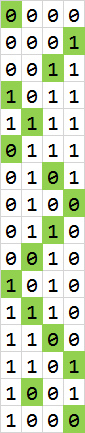 A different sub-class of Gray codes are described as Balanced Gray codes. These have the intresting property that there are the same number of state transitions per bit. Take this example on the left for a 4-bit code. As with all Gray codes, each row differs from the row above and below by just one digit change. However, this code has the interesting property that each bit changes state exactly four times. It is uniformly balanced. The green squares show the location where each bit toggles state. This property has advantages in the physical world. Imagine, for instance that, instead of light sensors in our belt example above, a machine was using physical switches for each of the bits to convey state. If the vanilla reflective binary Gray code were used, some switches would get considerably more use and wear than others. As physical switches have a finite life, it is more likely that the heavily used switches would fail first. By using a balance Gray code, each switch can be utilized to the same number of on/off operations in a complete cycle. Each switch will, therefore, experience approximately the same wear. It's not always possible to make a perfectly balanced cycle. With four bits, there are 16 signals to make, so each switch can experience four transitions. With five bits, there are 32 combinations to encode, but 32 does not divide equally by 5, so there will need to be asymmetric uses of the switches. (Outside the scope of this posting, but it is possible to generate balanced Gray code systems if there are an even number of bits). |