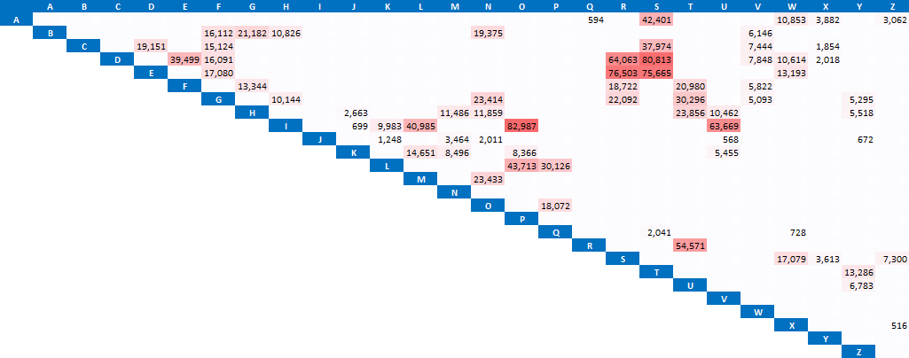 It’s far from scientific, because the database of words I am using is not normalized based on frequency of everyday usage (but then again, we’re looking for the chance a slip will make a legitimate word and make an atomic error, no matter how obscure the newly created word is). Below is a table showing the count of each two-letter transposition if it contributed to making another legal word in the dictionary file.