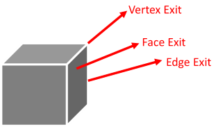 Rather than two cases (edge or corner), there are three exit cases when we are dealing in 3d. The laser can exit the face, a cube edge, or a cube vertex. |