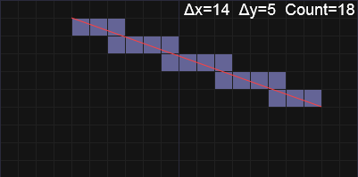 Instructions: Click on the grid to draw a line connecting that location with the last location clicked, or alternatively, drag to make a line between two locations of your choice. The rubric in the top right gives the delta between the two coordinates, and the count of the number of squares bisected. What is the relationship between Δx, Δy and the count?