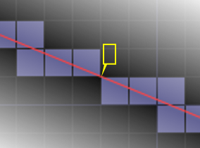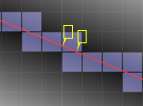 When does the line pass through a corner? This happens when the coordinate pair delta have common factors (integer multiples). When the coordinate deltas are relatively prime, the line never passes through a corner, but for each common factor it does (for more background on this, check out prime factors).