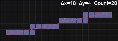 Here's an examples with Δx=18 and Δy=4 Count = 18 + 4 - GCD(18,4) = 18 + 4 - 2 = 20 Answer: 20 squares are cut. |