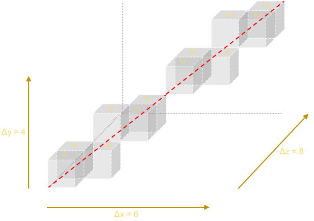 With a little thinking, we can expand this formula to work in 3D. It's a little bit harder visualize, but imagine firing a laser from one corner of a rectangular slap of cubes to another corner. How many cubes will be passed through?